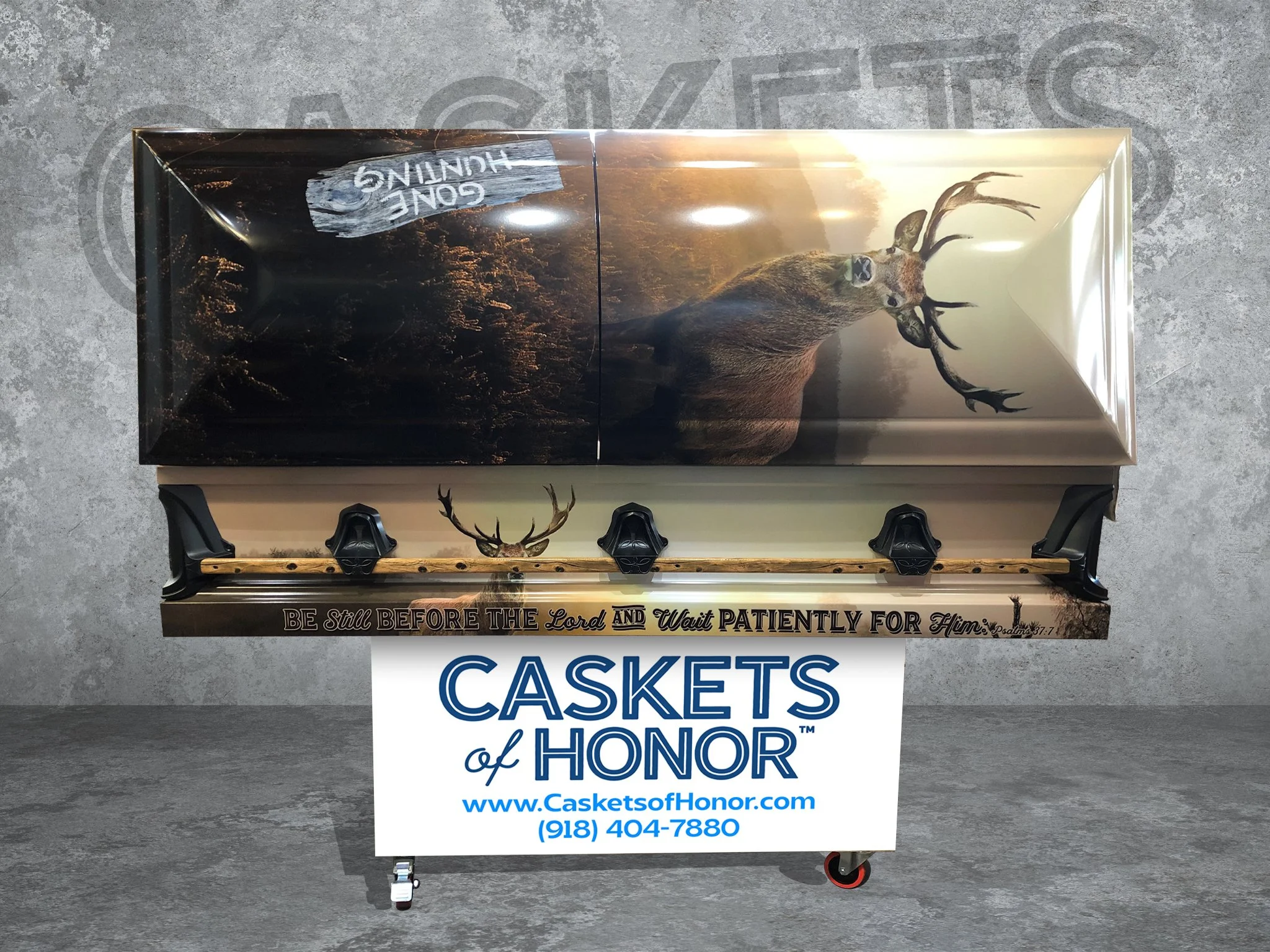 This series of hunting caskets is dedicated to the men and women who love the outdoors and hunting lifestyle. It has a Monster Red Stag and gun metal black textured hardware with distressed handles matching the casket. The bible quote says “Be still before the Lord and wait patiently for him” psalms 37:7. It has a Monster Red Stag on the lid with the early morning South Texas as the background. This design looks beautiful when wrapped on a casket .
